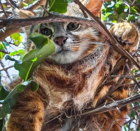 Hace algunos días, un gato colocolo fue captado descansando tranquilamente en las ramas de un árbol en una casa en la comuna de Papudo,